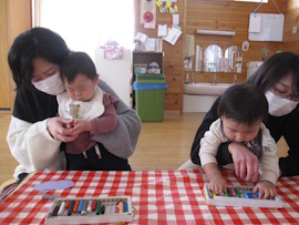 ・制作~鬼のお面制作~(終了) お母さんがつくっているおにのおめんづくりの横で初めて見るクレヨンに興味津々のお友だちでした。 ![]() |